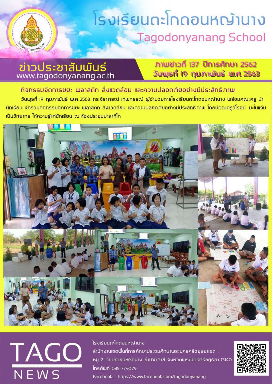 วันพุธที่ 19 กุมภาพันธ์ พ.ศ. 2563 ดร.จิราภรณ์ เทพกรรณ์ ผู้อำนวยการโรงเรียนตะโกดอนหญ้านาง พร้อมคณะครู นำนักเรียน เข้าร่วมกิจกรรมจัดการขยะ พลาสติก สิ่งแวดล้อม และความปลอดภัยอย่างมีประสิทธิภาพ โดยมีคุณครูวิโรจน์ มะโนแจ่ม และคณะครู เป็นวิทยากร ให้ความรู้แก่นักเรียน ณ ห้องประชุมปาสาทิโก