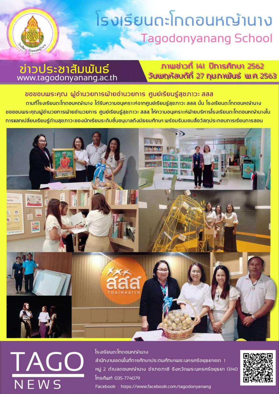 ตามที่โรงเรียนตะโกดอนหญ้านาง ได้รับความอนุเคราะห์จากศูนย์เรียนรู้สุขภาวะ สสส. นั้น โรงเรียนตะโกดอนหญ้านางขอขอบพระคุณผู้อำนวยการฝ่ายอำนวยการ ศูนย์เรียนรู้สุขภาวะ สสส. ให้ความอนุเคราะห์ฝ่ายบริหารโรงเรียนตะโกดอนหญ้านางในการแลกเปลี่ยนเรียนรู้ด้านสุขภาวะของนักเรียนระดับชั้นอนุบาลถึงมัธยมศึกษา พร้อมรับมอบสื่อวัสดุประกอบการเรียนการสอน
