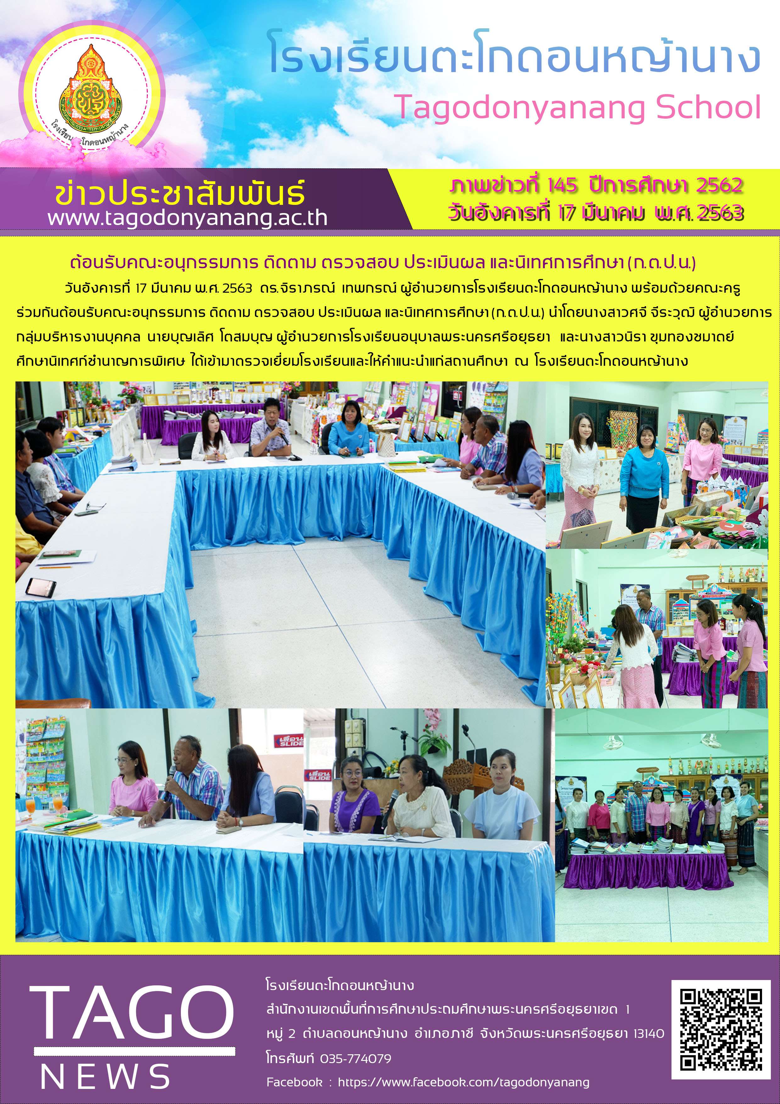 วันอังคารที่ 17 มีนาคม พ.ศ. 2563 ดร.จิราภรณ์ เทพกรณ์ ผู้อำนวยการโรงเรียนตะโกดอนหญ้านาง พร้อมด้วยคณะครู ร่วมกันต้อนรับคณะอนุกรรมการ ติดตาม ตรวจสอบ ประเมินผล และนิเทศการศึกษา (ก.ต.ป.น.) นำโดยนางสาวศจี จีระวุฒิ ผู้อำนวยการกลุ่มบริหารงานบุคคล นายบุญเลิศ โตสมบุญ ผู้อำนวยการโรงเรียนอนุบาลพระนครศรีอยุธยา และนางสาวนิรา ขุมทองชมาตย์ ศึกษานิเทศก์ชำนาญการพิเศษ ได้เข้ามาตรวจเยี่ยมโรงเรียนและให้คำแนะนำแก่สถานศึกษา ณ โรงเรียนตะโกดอนหญ้านาง
