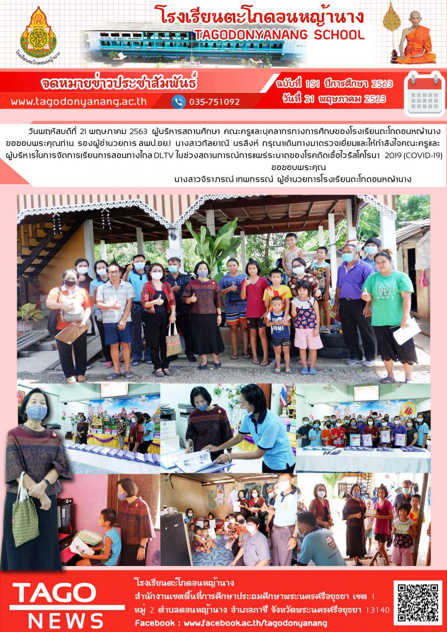 ขอขอบพระคุณ ท่านรองผู้อำนวยการ สพป.อย.1 นางสาวกัลยาณี นรสิงห์ กรุณาเดินทางมาตรวจเยี่ยมและให้กำลังใจคณะครูและผู้บริหารในการจัดการเรียนการสอนทางไกล DLTV ในช่วงสถานการณ์การแพร่ระบาดของโรคติดเชื้อไวรัสโคโรนา 2019 (COVID-19)