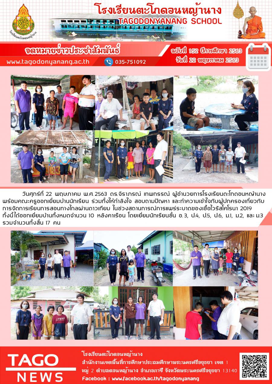 วันศุกร์ที่ 22 พฤษภาคม พ.ศ. 2563 ดร.จิราภรณ์ เทพกรรณ์ ผู้อำนวยการโรงเรียนตะโกดอนหญ้านาง พร้อมคณะครูออกเยี่ยมบ้านนักเรียน ร่วมทั้งให้กำลังใจ สอบถามปัญหา และทำความเข้าใจกับผู้ปกครองเกี่ยวกับการจัดการเรียนการสอนทางไกลผ่านดาวเทียม ในช่วงสถานการณ์การแพร่ระบาดของเชื้อไวรัสโคโรนา 2019 ทั้งนี้ได้ออกเยี่ยมบ้านทั้งหมดจำนวน 10 หลังคาเรือน โดยเยี่ยมนักเรียนชั้น อ. 3, ป.4, ป.5, ป.6, ม.1, ม.2, และ ม.3 รวมจำนวนทั้งสิ้น 17 คน