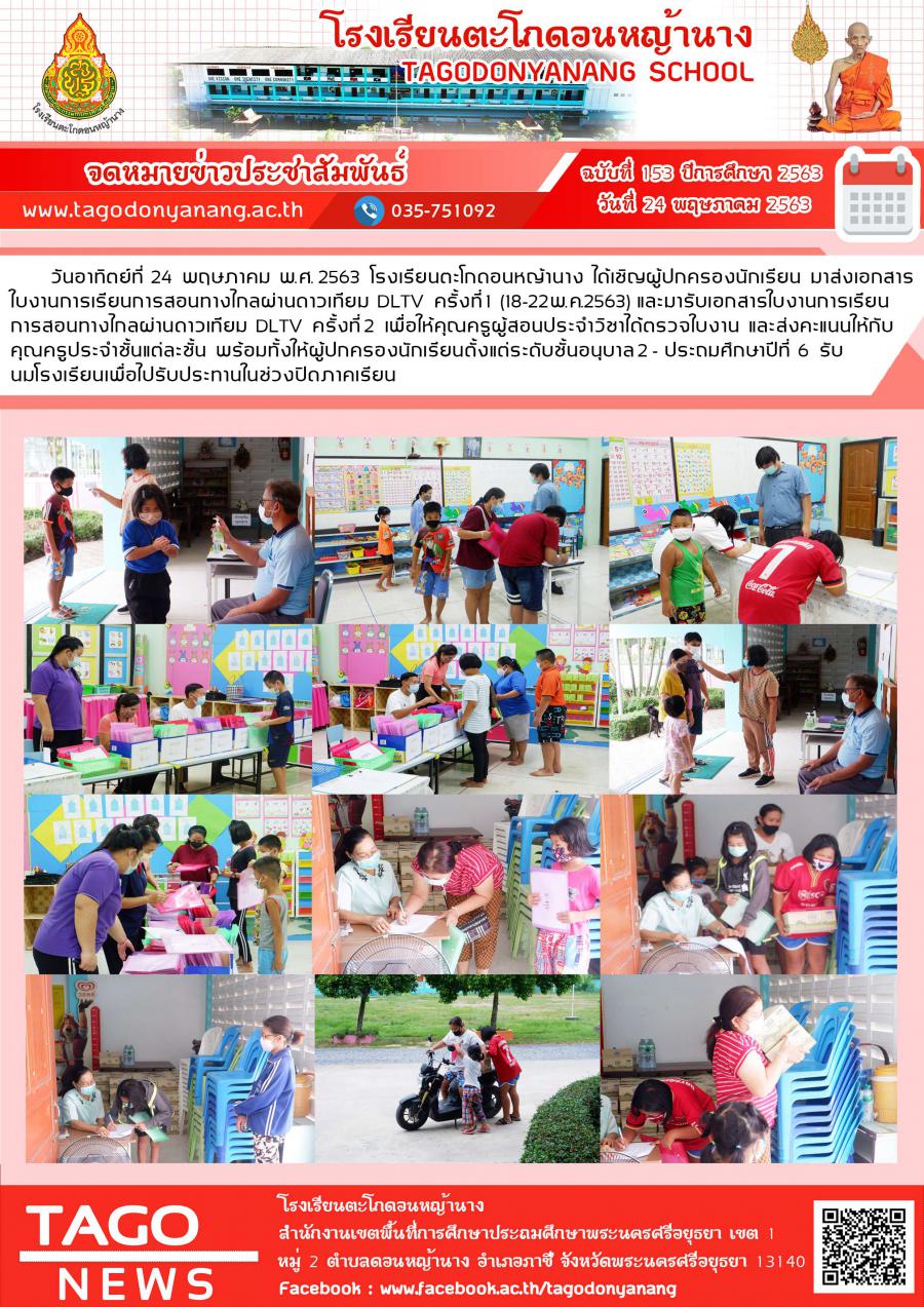 วันอาทิตย์ที่ 24 พฤษภาคม พ.ศ. 2563 โรงเรียนตะโกดอนหญ้านาง ได้เชิญผู้ปกครองนักเรียน มาส่งเอกสารใบงานการเรียนการสอนทางไกลผ่านดาวเทียม DLTV ครั้งที่ 1 (18-22พ.ค.2563) และมารับเอกสารใบงานการเรียนการสอนทางไกลผ่านดาวเทียม DLTV ครั้งที่ 2 เพื่อให้คุณครูผู้สอนประจำวิชาได้ตรวจใบงาน และส่งคะแนนให้กับคุณครูประจำชั้นแต่ละชั้น พร้อมทั้งให้ผู้ปกครองนักเรียนตั้งแต่ระดับชั้นอนุบาล 2 - ประถมศึกษาปีที่ 6 รับนมโรงเรียนเพื่อไปรับประทานในช่วงปิดภาคเรียน