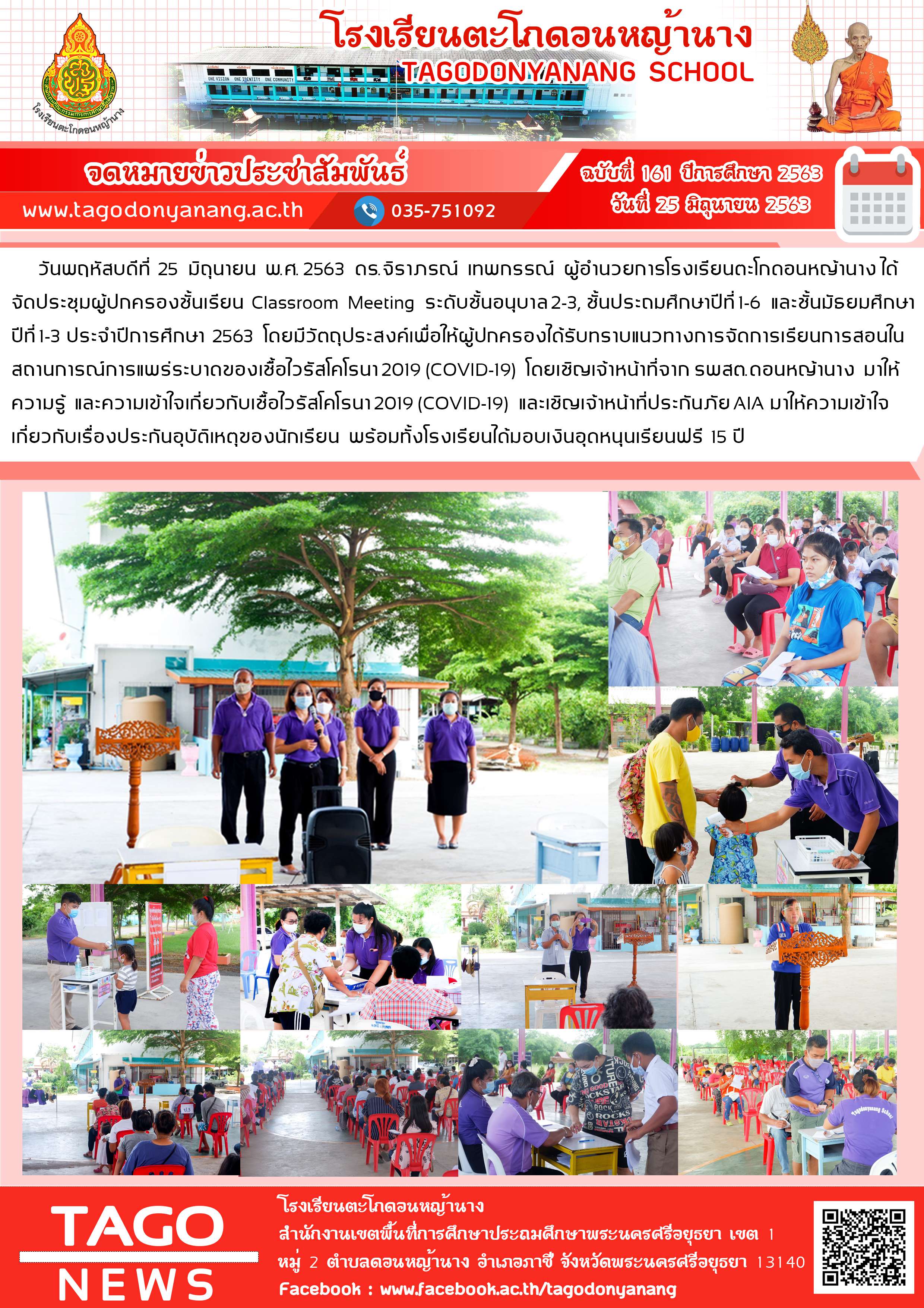 วันพฤหัสบดีที่ 25 มิถุนายน พ.ศ. 2563 ดร.จิราภรณ์ เทพกรรณ์ ผู้อำนวยการโรงเรียนตะโกดอนหญ้านาง ได้จัดประชุมผู้ปกครองชั้นเรียน Classroom Meeting ระดับชั้นอนุบาล 2-3, ชั้นประถมศึกษาปีที่ 1-6 และชั้นมัธยมศึกษาปีที่ 1-3 ประจำปีการศึกษา 2563 โดยมีวัตถุประสงค์เพื่อให้ผู้ปกครองได้รับทราบแนวทางการจัดการเรียนการสอนในสถานการณ์การแพร่ระบาดของเชื้อไวรัสโคโรนา 2019 (COVID-19) โดยเชิญเจ้าหน้าที่จาก รพสต.ดอนหญ้านาง มาให้ความรู้ และความเข้าใจเกี่ยวกับเชื้อไวรัสโคโรนา 2019 (COVID-19) และเชิญเจ้าหน้าที่ประกันภัย AIA มาให้ความเข้าใจเกี่ยวกับเรื่องประกันอุบัติเหตุของนักเรียน พร้อมทั้งโรงเรียนได้มอบเงินอุดหนุนเรียนฟรี 15 ปี