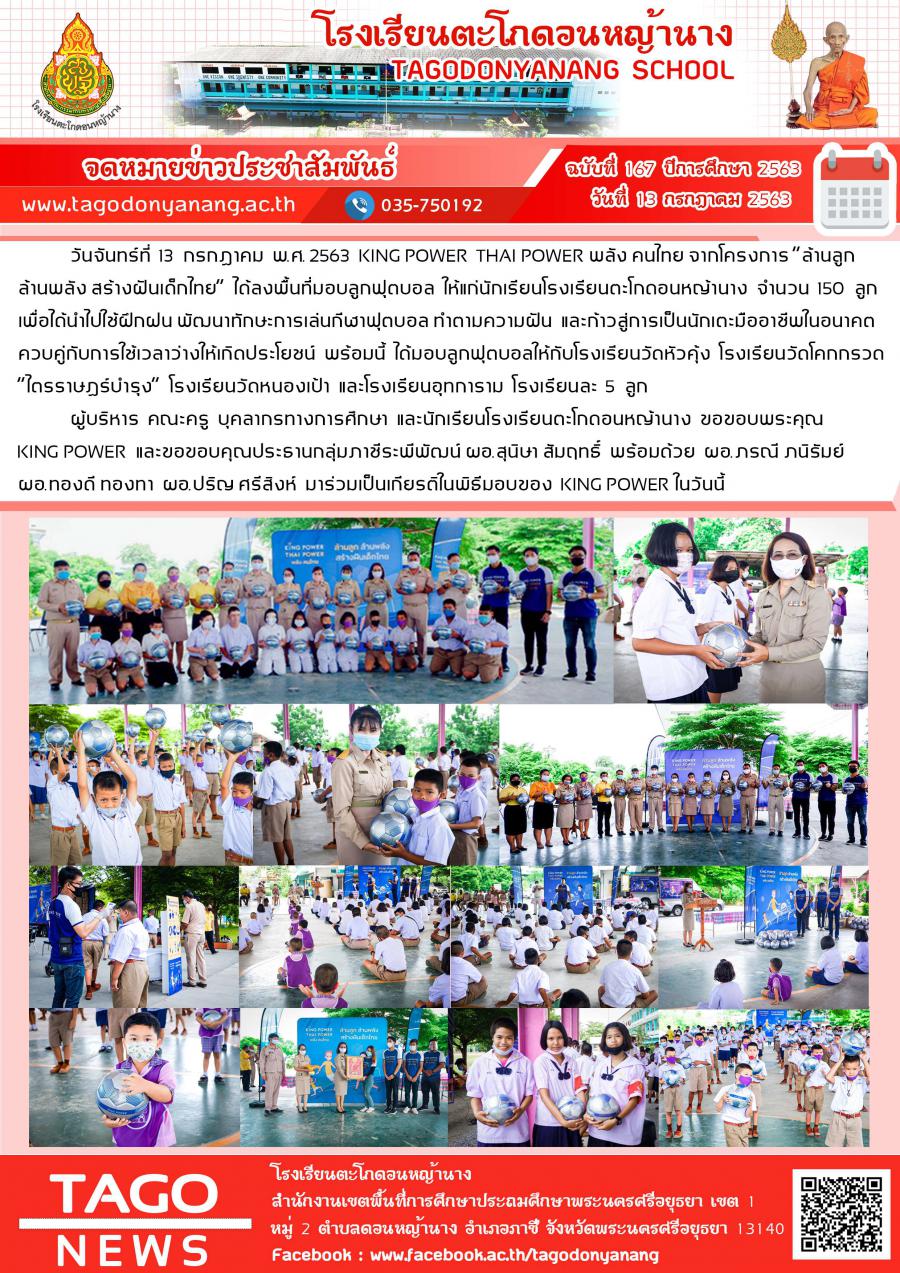 วันจันทร์ที่ 13 กรกฎาคม พ.ศ. 2563 KING POWER THAI POWER พลัง คนไทย จากโครงการ “ล้านลูก ล้านพลัง สร้างฝันเด็กไทย” ได้ลงพื้นที่มอบลูกฟุตบอล ให้แก่นักเรียนโรงเรียนตะโกดอนหญ้านาง จำนวน 150 ลูก เพื่อได้นำไปใช้ฝึกฝน พัฒนาทักษะการเล่นกีฬาฟุตบอล ทำตามความฝัน และก้าวสู่การเป็นนักเตะมืออาชีพในอนาคต ควบคู่กับการใช้เวลาว่างให้เกิดประโยชน์ พร้อมนี้ ได้มอบลูกฟุตบอลให้กับโรงเรียนวัดหัวคุ้ง โรงเรียนวัดโคกกรวด“ไตรราษฎร์บำรุง” โรงเรียนวัดหนองเป้า และโรงเรียนอุทการาม โรงเรียนละ 5 ลูก