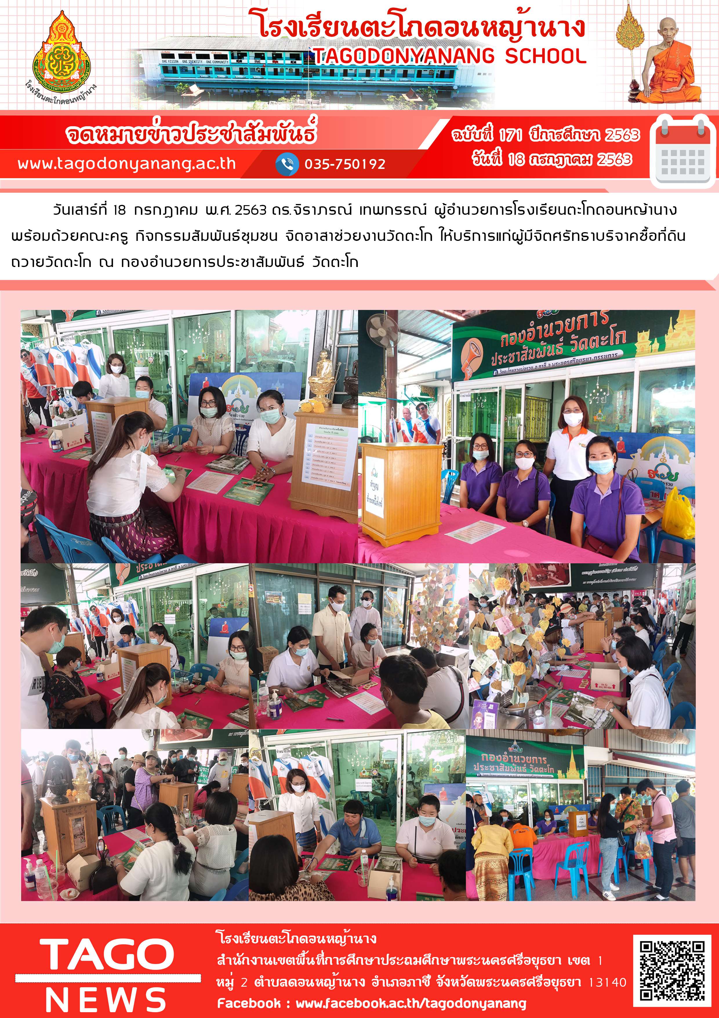 วันเสาร์ที่ 18 กรกฎาคม พ.ศ. 2563 ดร.จิราภรณ์ เทพกรรณ์ ผู้อำนวยการโรงเรียนตะโกดอนหญ้านาง พร้อมด้วยคณะครู กิจกรรมสัมพันธ์ชุมชน จิตอาสาช่วยงานวัดตะโก ให้บริการแก่ผู้มีจิตศรัทธาบริจาคซื้อที่ดิน ถวายวัดตะโก ณ กองอำนวยการประชาสัมพันธ์ วัดตะโก