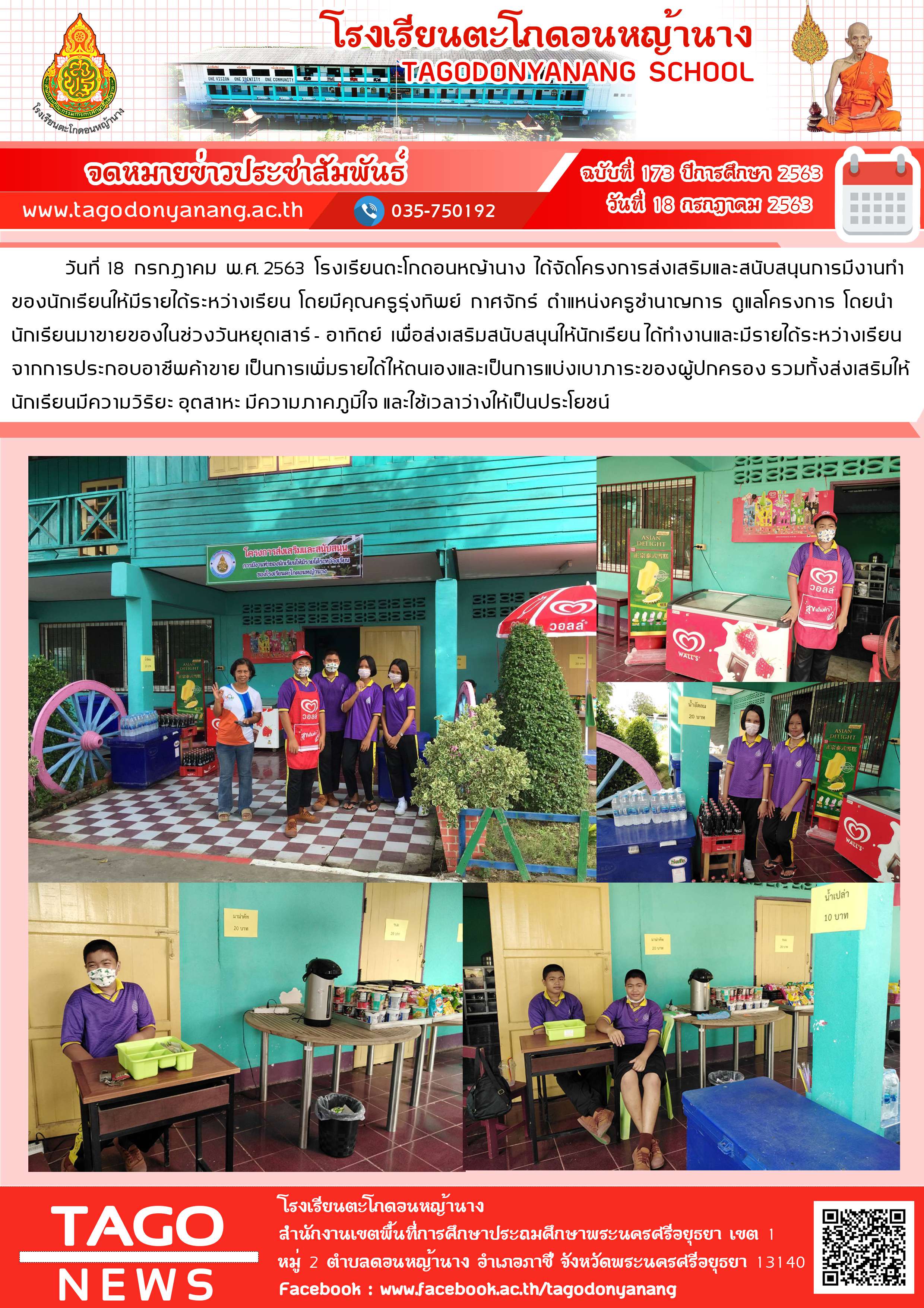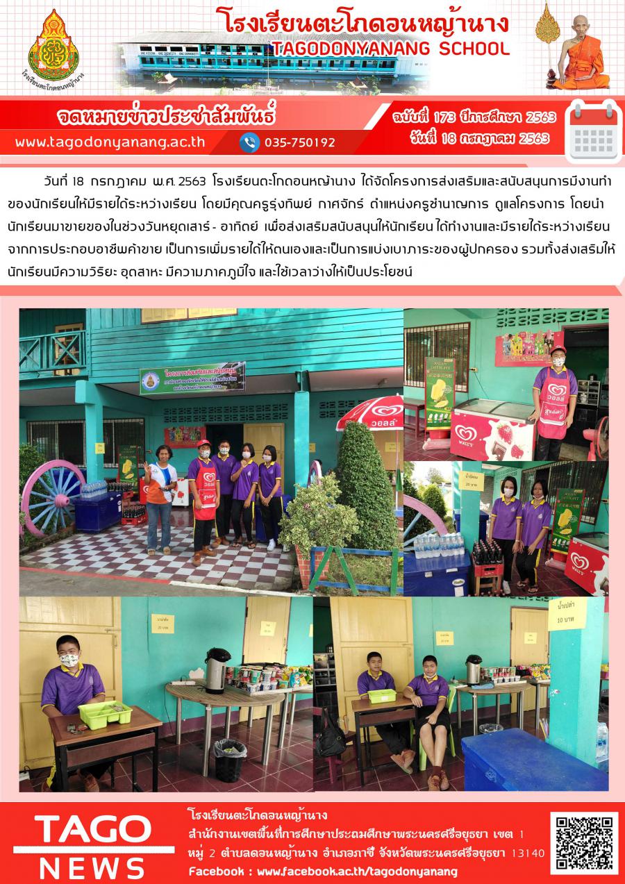 วันที่ 18 กรกฎาคม พ.ศ. 2563 โรงเรียนตะโกดอนหญ้านาง ได้จัดโครงการส่งเสริมและสนับสนุนการมีงานทำของนักเรียนให้มีรายได้ระหว่างเรียน โดยมีคุณครูรุ่งทิพย์ กาศจักร์ ตำแหน่งครูชำนาญการ ดูแลโครงการ โดยนำนักเรียนมาขายของในช่วงวันหยุดเสาร์ - อาทิตย์ เพื่อส่งเสริมสนับสนุนให้นักเรียน ได้ทำงานและมีรายได้ระหว่างเรียนจากการประกอบอาชีพค้าขาย เป็นการเพิ่มรายได้ให้ตนเองและเป็นการแบ่งเบาภาระของผู้ปกครอง รวมทั้งส่งเสริมให้นักเรียนมีความวิริยะ อุตสาหะ มีความภาคภูมิใจ และใช้เวลาว่างให้เป็นประโยชน์