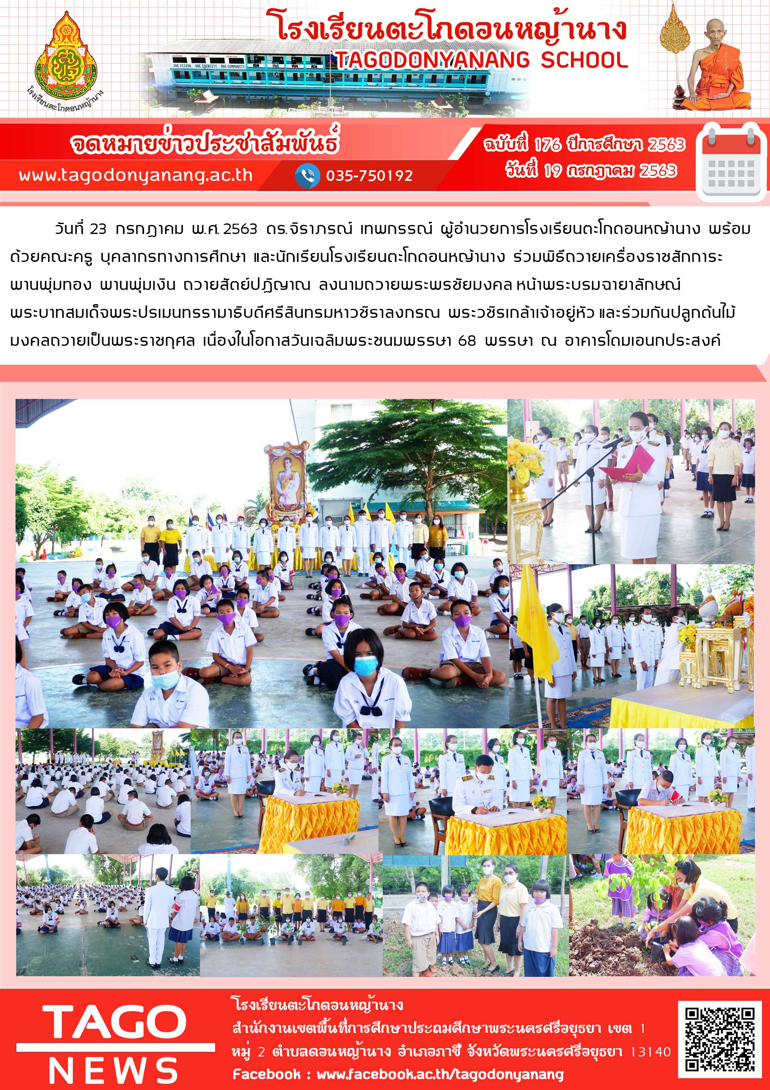 วันที่ 23 กรกฎาคม พ.ศ. 2563 ดร.จิราภรณ์ เทพกรรณ์ ผู้อำนวยการโรงเรียนตะโกดอนหญ้านาง พร้อมด้วยคณะครู บุคลากรทางการศึกษา และนักเรียนโรงเรียนตะโกดอนหญ้านาง ร่วมพิธีถวายเครื่องราชสักการะ พานพุ่มทอง พานพุ่มเงิน ถวายสัตย์ปฏิญาณ ลงนามถวายพระพรชัยมงคล หน้าพระบรมฉายาลักษณ์พระบาทสมเด็จพระเจ้าอยู่หัว และร่วมกันปลูกต้นไม้มงคลถวายเป็นพระราชกุศล เนื่องในโอกาสวันเฉลิมพระชนมพรรษาพระบาทสมเด็จพระวชิรเกล้าเจ้าอยู่หัว ประจำปี พุทธศักราช 2563 ณ อาคารโดมเอนกประสงค์