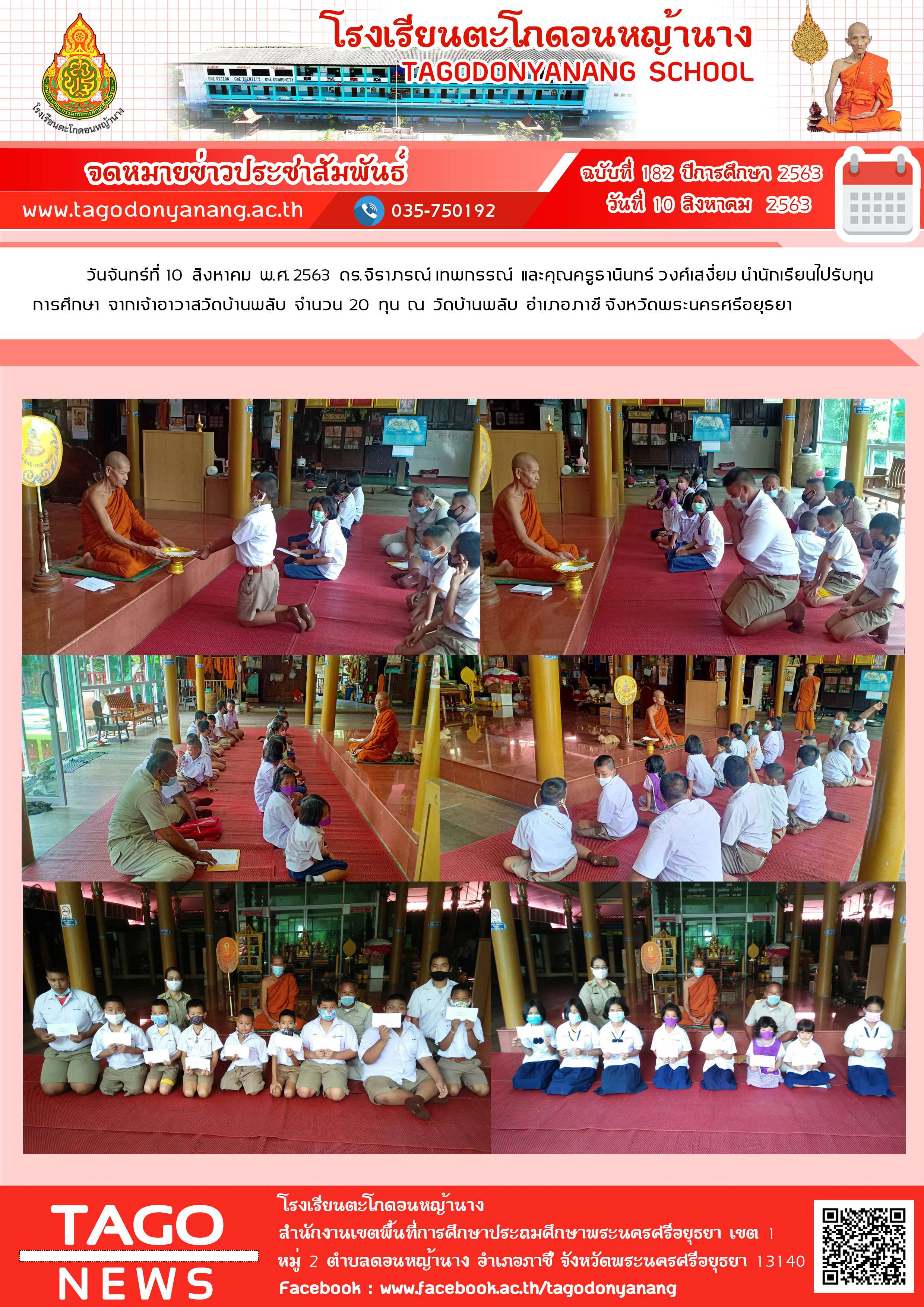 วันจันทร์ที่ 10 สิงหาคม พ.ศ. 2563 ดร.จิราภรณ์ เทพกรรณ์ และคุณครูธานินทร์ วงศ์เสงี่ยม นำนักเรียนไปรับทุนการศึกษา จากเจ้าอาวาสวัดบ้านพลับ จำนวน 20 ทุน ณ วัดบ้านพลับ อำเภอภาชี จังหวัดพระนครศรีอยุธยา