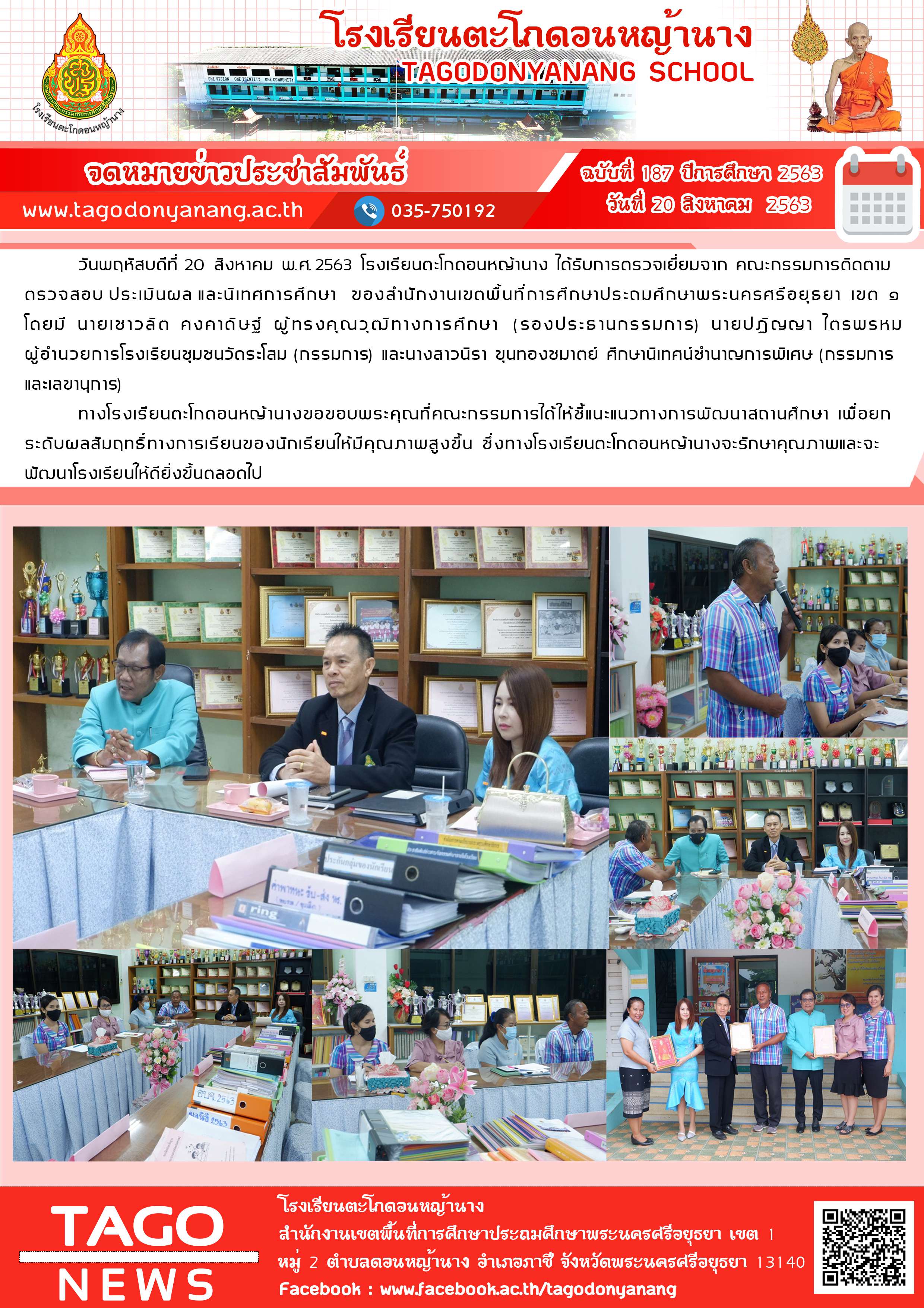วันพฤหัสบดีที่ 20 สิงหาคม พ.ศ. 2563 โรงเรียนตะโกดอนหญ้านาง ได้รับการตรวจเยี่ยมจาก คณะกรรมการติดตาม ตรวจสอบ ประเมินผล และนิเทศการศึกษา ของสำนักงานเขตพื้นที่การศึกษาประถมศึกษาพระนครศรีอยุธยา เขต ๑ โดยมี นายเชาวลิต คงคาดิษฐ์ ผู้ทรงคุณวุฒิทางการศึกษา (รองประธานกรรมการ) นายปฏิญญา ไตรพรหม ผู้อำนวยการโรงเรียนชุมชนวัดระโสม (กรรมการ) และนางสาวนิรา ขุนทองชมาตย์ ศึกษานิเทศน์ชำนาญการพิเศษ (กรรมการและเลขานุการ)