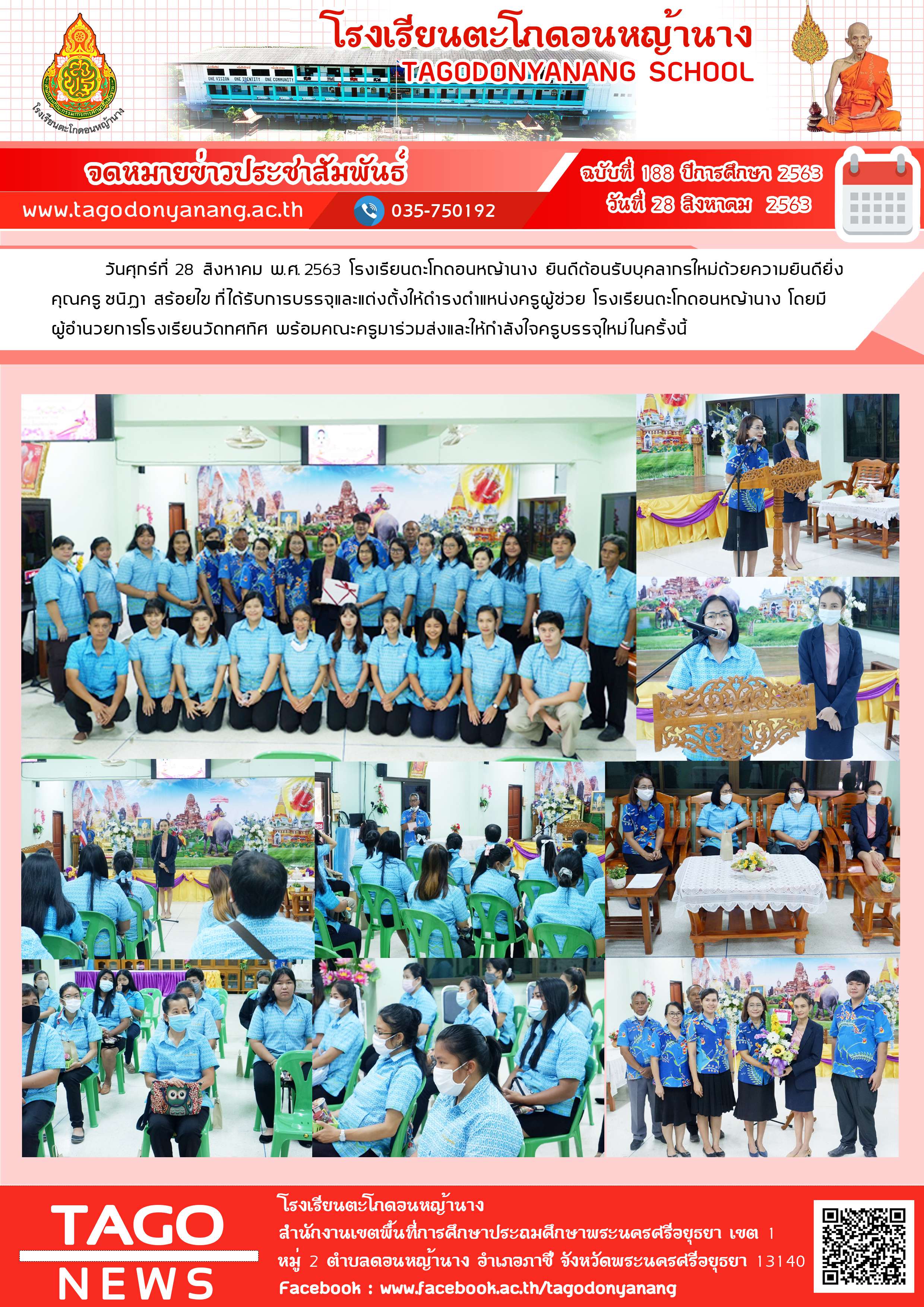 วันศุกร์ที่ 28 สิงหาคม พ.ศ. 2563 โรงเรียนตะโกดอนหญ้านาง ยินดีต้อนรับบุคลากรใหม่ด้วยความยินดียิ่ง คุณครู ชนิฏา สร้อยไข ที่ได้รับการบรรจุและแต่งตั้งให้ดำรงตำแหน่งครูผู้ช่วย โรงเรียนตะโกดอนหญ้านาง โดยมีผู้อำนวยการโรงเรียนวัดทศทิศ พร้อมคณะครูมาร่วมส่งและให้กำลังใจครูบรรจุใหม่ในครั้งนี้