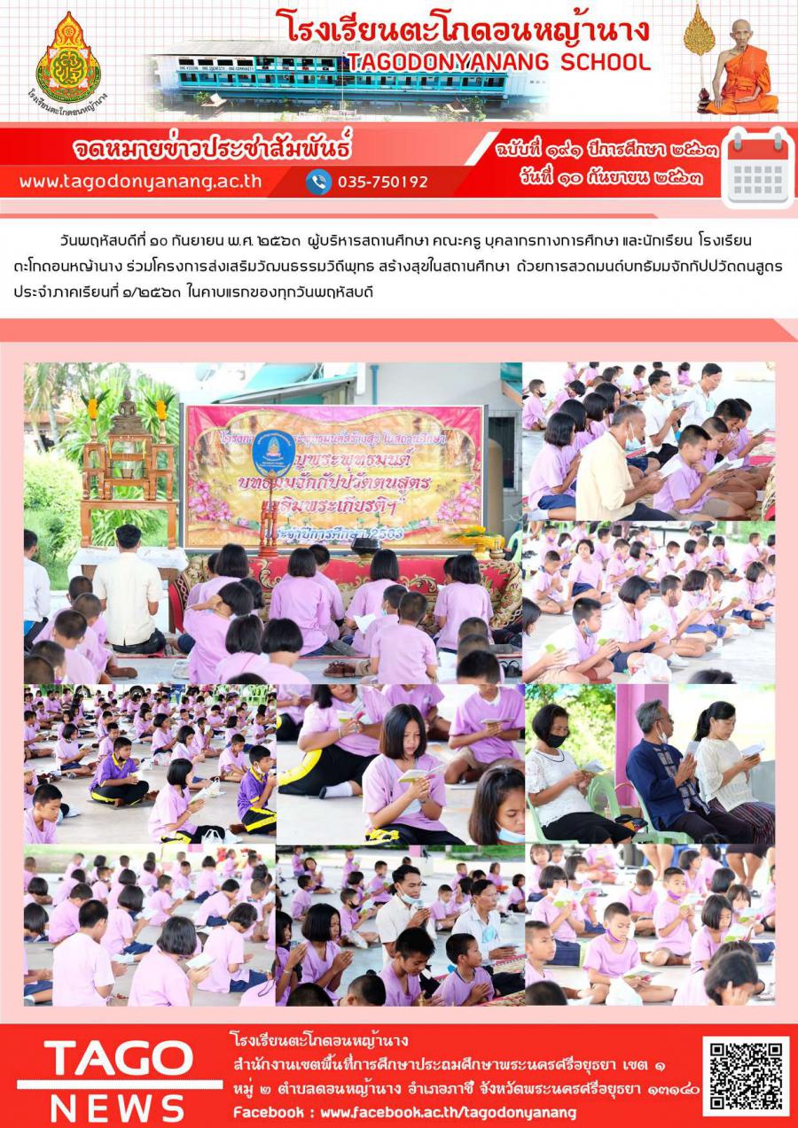 วันพฤหัสบดีที่ ๑๐ กันยายน พ.ศ. ๒๕๖๓ ผู้บริหารสถานศึกษา คณะครู บุคลากรทางการศึกษา และนักเรียน โรงเรียนตะโกดอนหญ้านาง ร่วมโครงการส่งเสริมวัฒนธรรมวิถีพุทธ สร้างสุขในสถานศึกษา ด้วยการสวดมนต์บทธัมมจักกัปปวัตตนสูตรประจำภาคเรียนที่ ๑/๒๕๖๓ ในคาบแรกของทุกวันพฤหัสบดี