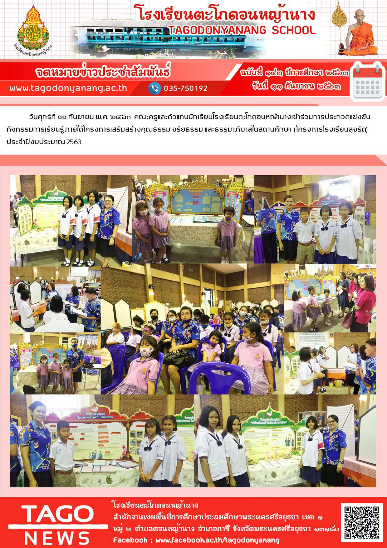 วันศุกร์ที่ ๑๑ กันยายน พ.ศ. ๒๕๖๓ คณะครูและตัวแทนนักเรียนโรงเรียนตะโกดอนหญ้านางเข้าร่วมการประกวดแข่งขันกิจกรรมการเรียนรู้ภายใต้โครงการเสริมสร้างคุณธรรม จริยธรรม และธรรมาภิบาลในสถานศึกษา (โครงการโรงเรียนสุจริต) ประจำปีงบประมาณ ๒๕๖๓