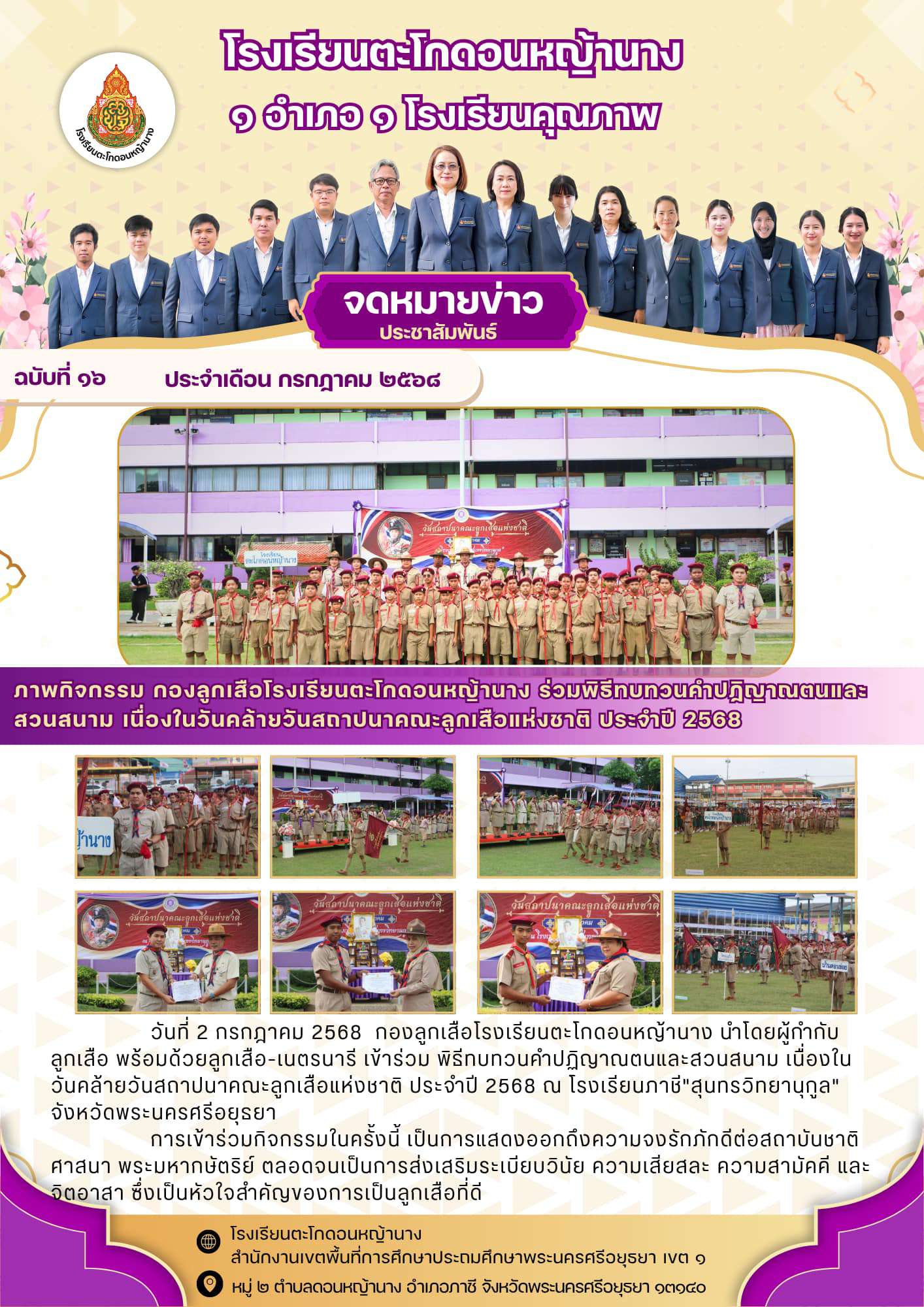 กองลูกเสือโรงเรียนตะโกดอนหญ้านาง เข้าร่วมพิธีทบทวนคำปฏิญาณและสวนสนาม เนื่องในวันคล้ายวันสถาปนาลูกเสือแห่งชาติ ประจำปี 2568