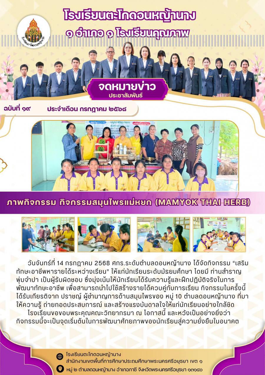 วันจันทร์ที่ 14 กรกฎาคม 2568 ศกร.ระดับตำบลดอนหญ้านาง ได้จัดกิจกรรม “เสริมทักษะอาชีพหารายได้ระหว่างเรียน” ให้แก่นักเรียนระดับมัธยมศึกษา โดยมี ท่านสำราญ พุ่มจำปา เป็นผู้รับผิดชอบ ซึ่งมุ่งเน้นให้นักเรียนได้รับความรู้และฝึกปฏิบัติจริงในการพัฒนาทักษะอาชีพ เพื่อสามารถนำไปใช้สร้างรายได้ควบคู่กับการเรียน กิจกรรมในครั้งนี้ ได้รับเกียรติจาก ปราชญ์ ผู้ชำนาญการด้านสมุนไพรของ หมู่ 10 ตำบลดอนหญ้านาง ที่มาให้ความรู้ ถ่ายทอดประสบการณ์ และสร้างแรงบันดาลใจให้แก่นักเรียนอย่างใกล้ชิด