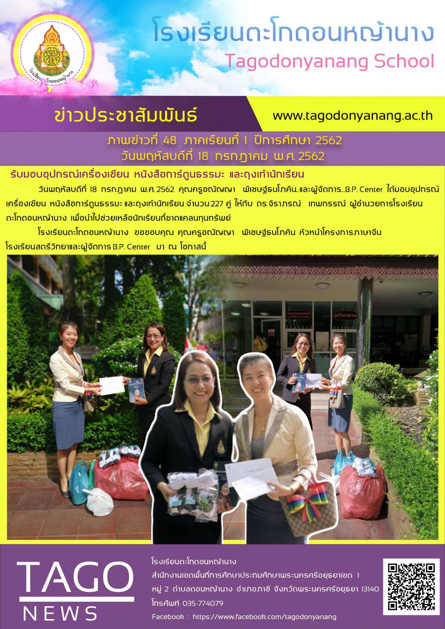 รับมอบอุปกรณ์เครื่องเขียน หนังสือการ์ตูนธรรมะ และถุงเท้านักเรียน