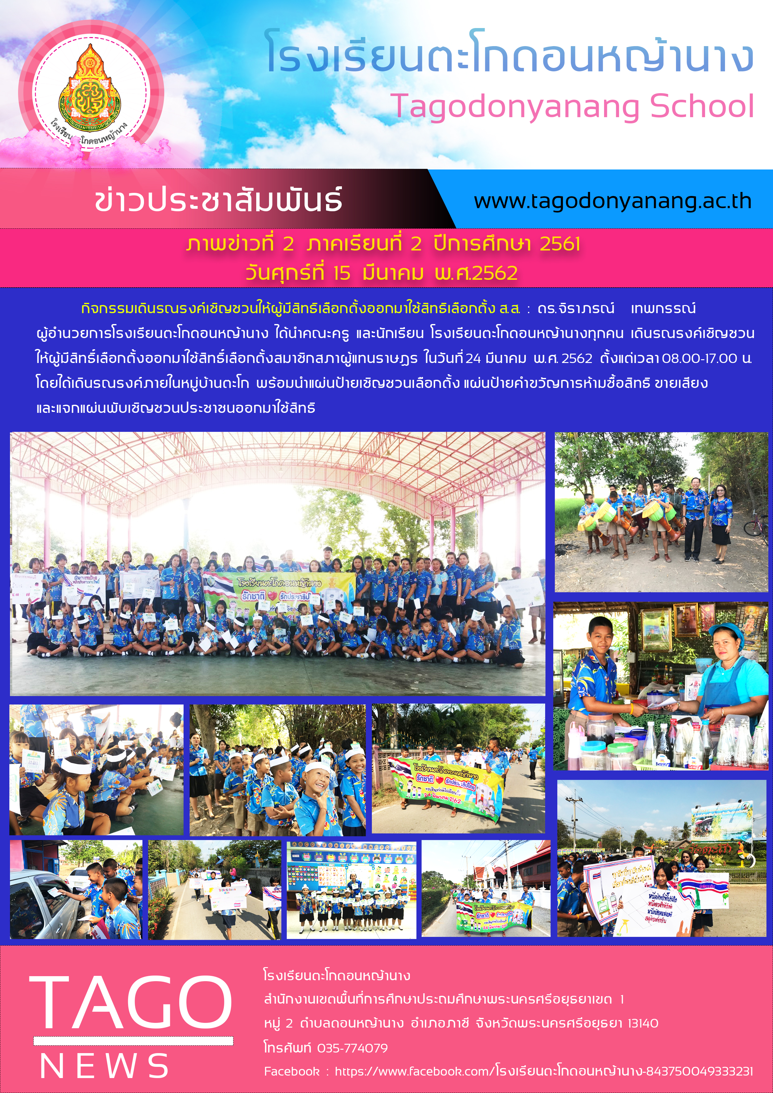 โรงเรียนตะโกดอนหญ้านาง อำเภอภาชี จังหวัดพระนครศรีอยุธยา เดินขบวนรณรงค์เชิญชวนประชาชนผู้มีสิทธิ์ในการเลือกตั้ง ไปใช้สิทธิ์ในวันที่ 24 มีนาคม 2562