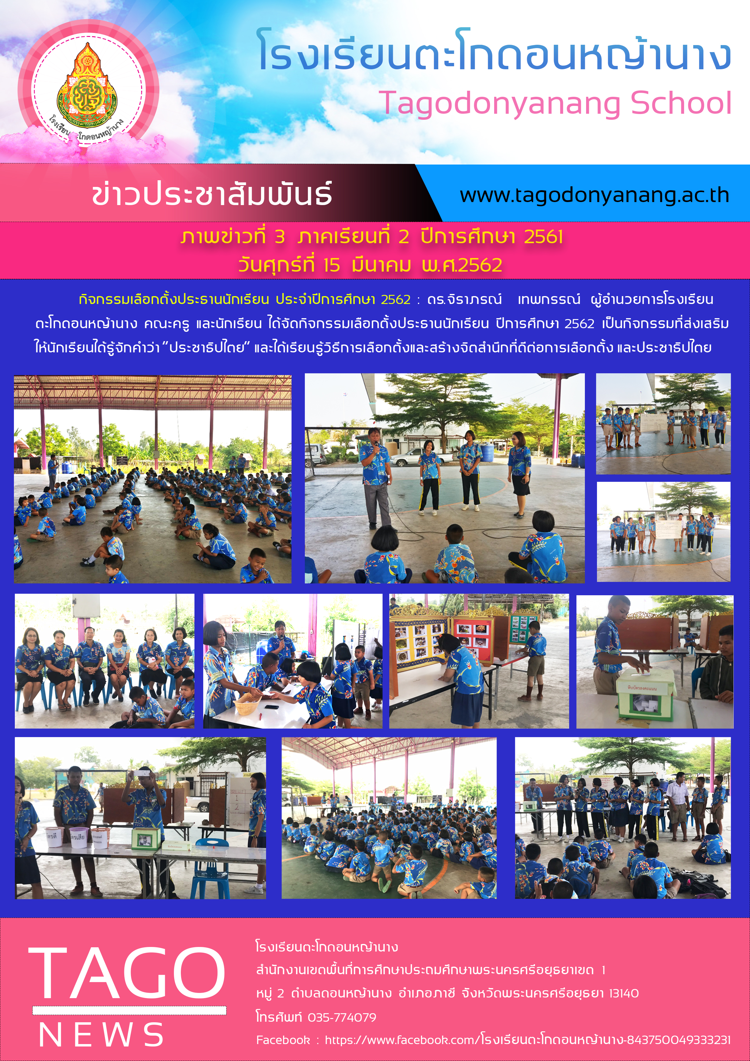 วันที่ 15 มีนาคม  พ.ศ.2562 เวลาประมาณ 13.00น.  ณ ลาน เอนกประสงค์(โดมใหญ่) โรงเรียนตะโกดอนหญ้านาง  อำเภอภาชี  จังหวัดพระนครศรีอยุธยา  มีการจัดการเลือกตั้งประธานนักเรียน และคณะกรรมการนักเรียน ปีการศึกษา 2562 โดยประธานนักเรียน และคณะกรรมการนักเรียน ปีการศึกษา 2561 ปฏิบัติหน้าที่เป็นคณะกรรมการการเลือกตั้ง ตั้งแต่เวลา 13:00 - 14:30 น. โดยผู้ที่ชนะการเลือกตั้งอย่างเป็นทางการ คือ ผู้ลงสมัครพรรคเบอร์  2 ด.ญ. กัญญ์วรา   ทองหมื่น