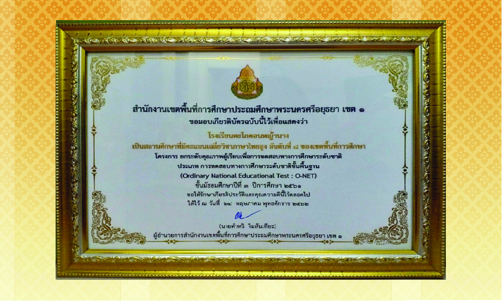 โรงเรียนตะโกดอนหญ้านางเป็นสถานศึกษาที่มีผลคะแนนเฉลี่ยวิชาภาษาไทยสูง อันดับที่8 ของเขตพื้นที่การศึกษา (O-NET)