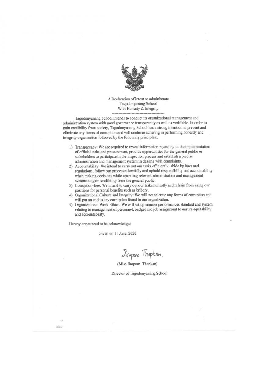 ประกาศโรงเรียนตะโกดอนหญ้านาง เรื่อง เจตจำนงสุจริตในการบริหารโรงเรียนตะโกดอนหญ้านาง